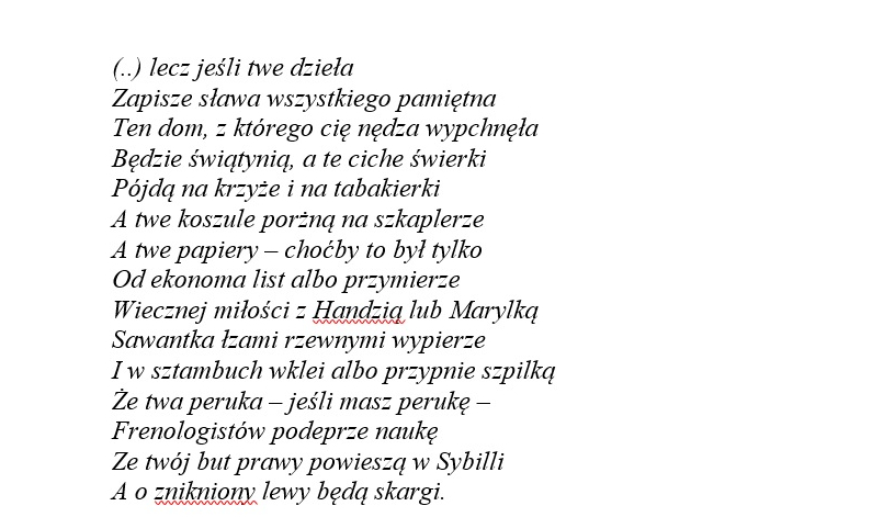 – Mogiła! – sarknął – znowu mogiła! Już druga dziś osoba wyprawia mię na mogiłę! Ależ ja za mogiły bardzo dziękuję… przede mną życie, sława…