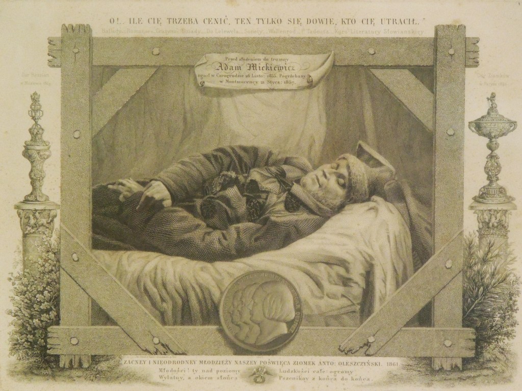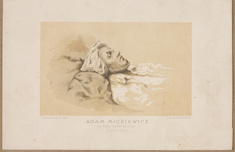 Nie jedynie Chopin poddany został procesowi tej swoistej funeralnej mitologizacji. Zręcznym bohaterem podobnego dyskursu, zwłaszcza w kontekście jego mesjanistycznych koncepcji, był Adam Mickiewicz. Już w dzień po jego śmierci (27.11.1855) powstała seria dzieł upamiętniających zmarłego: szkic rysunkowy, fotografia i gipsowy odlew twarzy. Poniechano odcięcia kosmyków włosów i wyjęcia serca (co zrobiono w przypadku kompozytora) bo domniemanym powodem zgonu poety była cholera i z tego względu zachowano „szczególne” środki ostrożności. Maska Mickiewicza nie odegrała ostatecznie w kulcie wieszcza roli, którą jej wróżono, spełniły ją za to graficzne repliki zdjęcia z łoża śmierci. Odziany w polski kaftan i konfederatkę, otoczony na litografii Antoniego Oleszczyńskiego z 1855 r. fragmentem Inwokacji, gałązkami dębu i lauru, wyniesiony został martwy Mickiewicz do rangi patriotycznego symbolu.