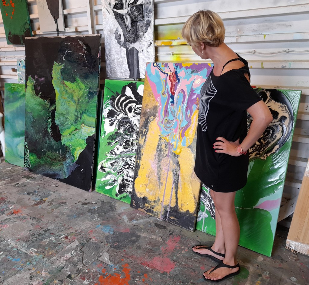 Pracując od lat w wielu mediach artystycznych, redefiniując ich granice stworzyła pojęcie malarstwa performatywnego, które określa jej autorską metodę i formę scalającą sztukę efemerycznego performansu z obrazem. To malarstwo abstrakcyjne, a ściślej jego nurt organiczny, gdzie liczy się spontaniczna, nieskrępowana ekspresja. Myliłby się jednak ten, który prychnięciem podsumować by chciał jej prace – ot farba leje się strumieniem i tyle. Zastygłe w fantazyjnych formach, napęczniałe cenną zawartością, naznaczone lejami malarskich wulkanów tuż po wybuchu, są kolejnym ogniwem w łańcuchu, którego źródła można by dopatrywać się w action painting Pollocka. Kiedy słuchałam, z jakim namysłem i skrupulatnością mistrzyni w swoim rzemiośle Izabela opowiadała o pracy nad obrazami, jej twórczość skojarzyła mi się także z matteryzmem, jego umiłowaniem dla struktury farby i uważnością na jej taktylny aspekt.