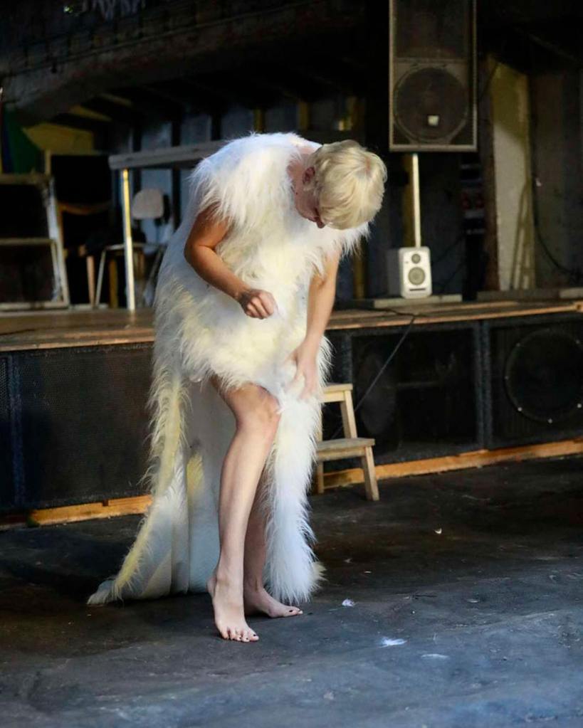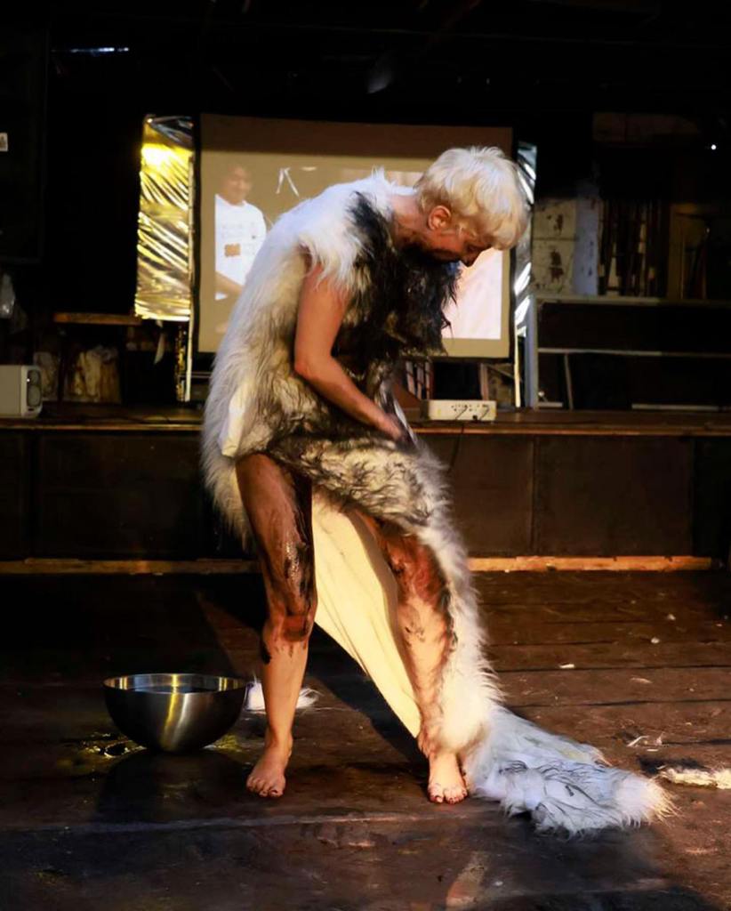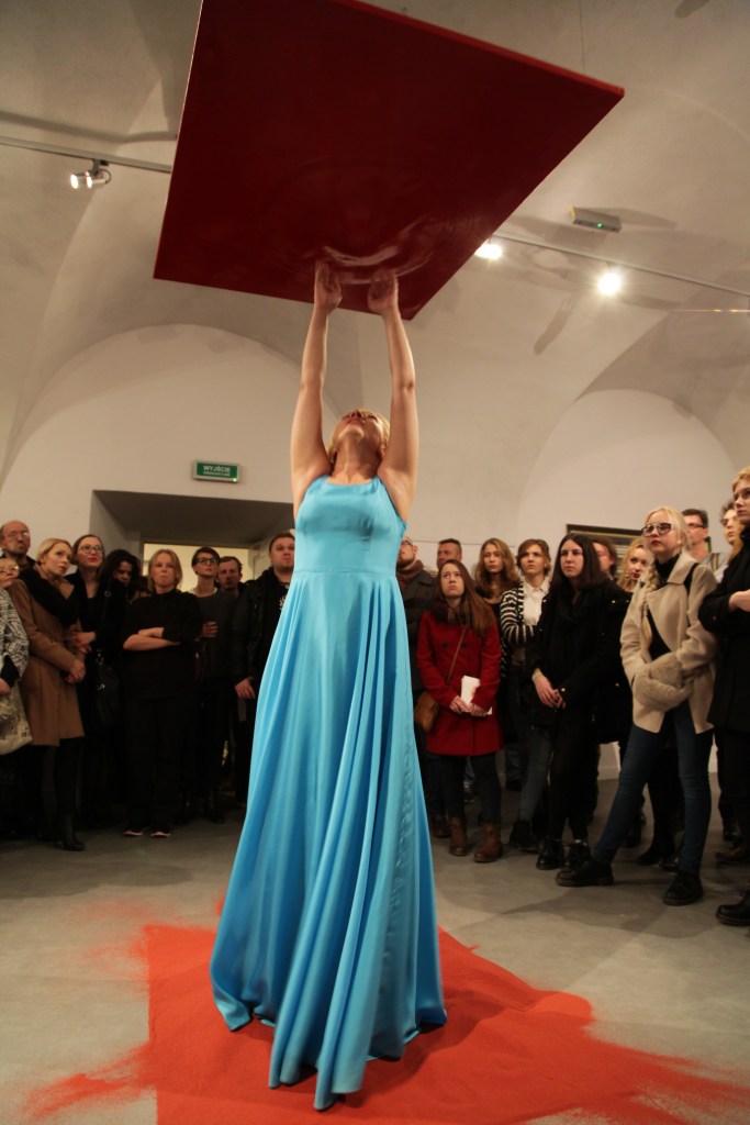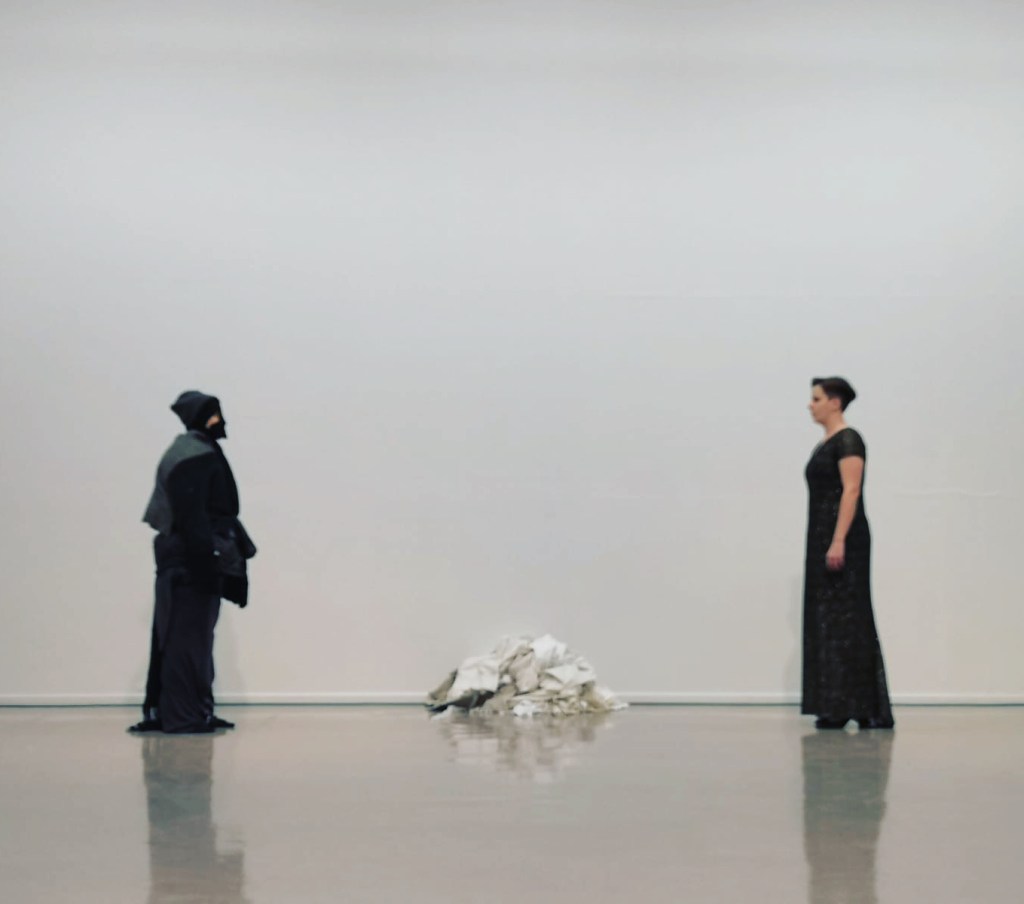 Zdjęcie okładki felietonu wykonane podczas performansu z 8 października 2021 MEPHOBIA, Mała Galeria w Nowym Sączu. fot. Karolina Tolka, źródło FB artystkihttps://www.facebook.com/izabela.chamczyk.art