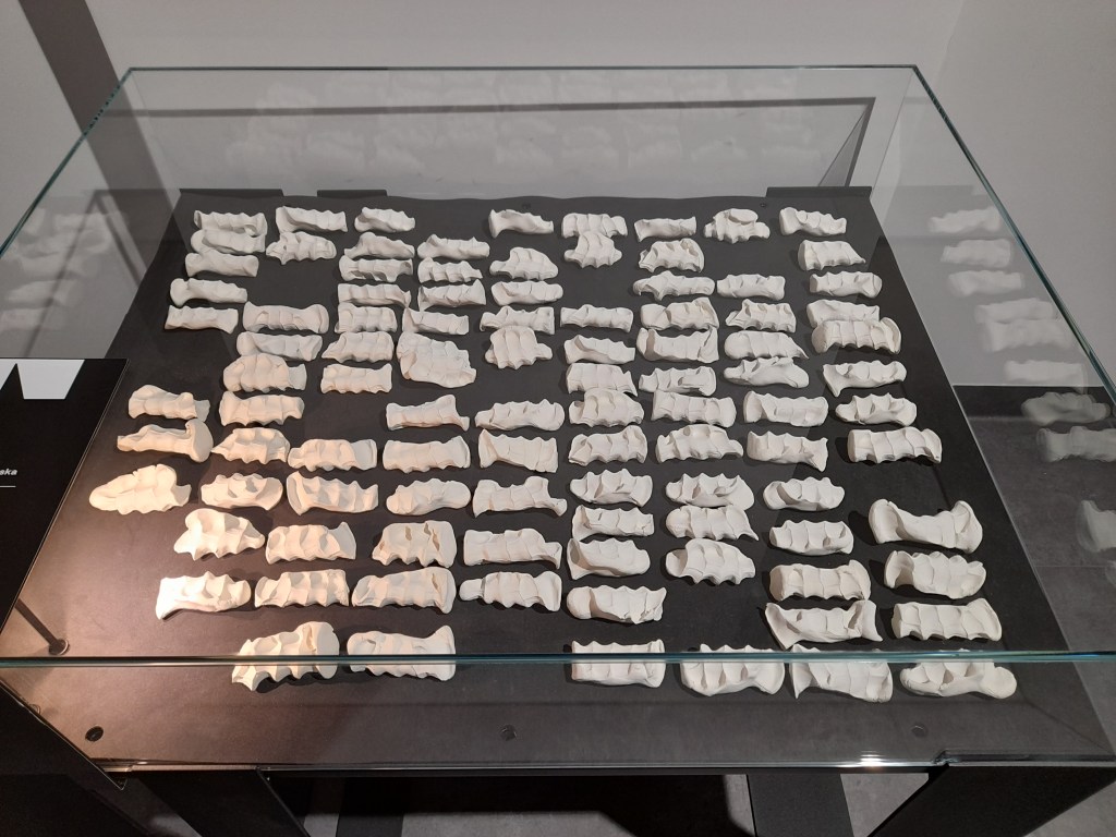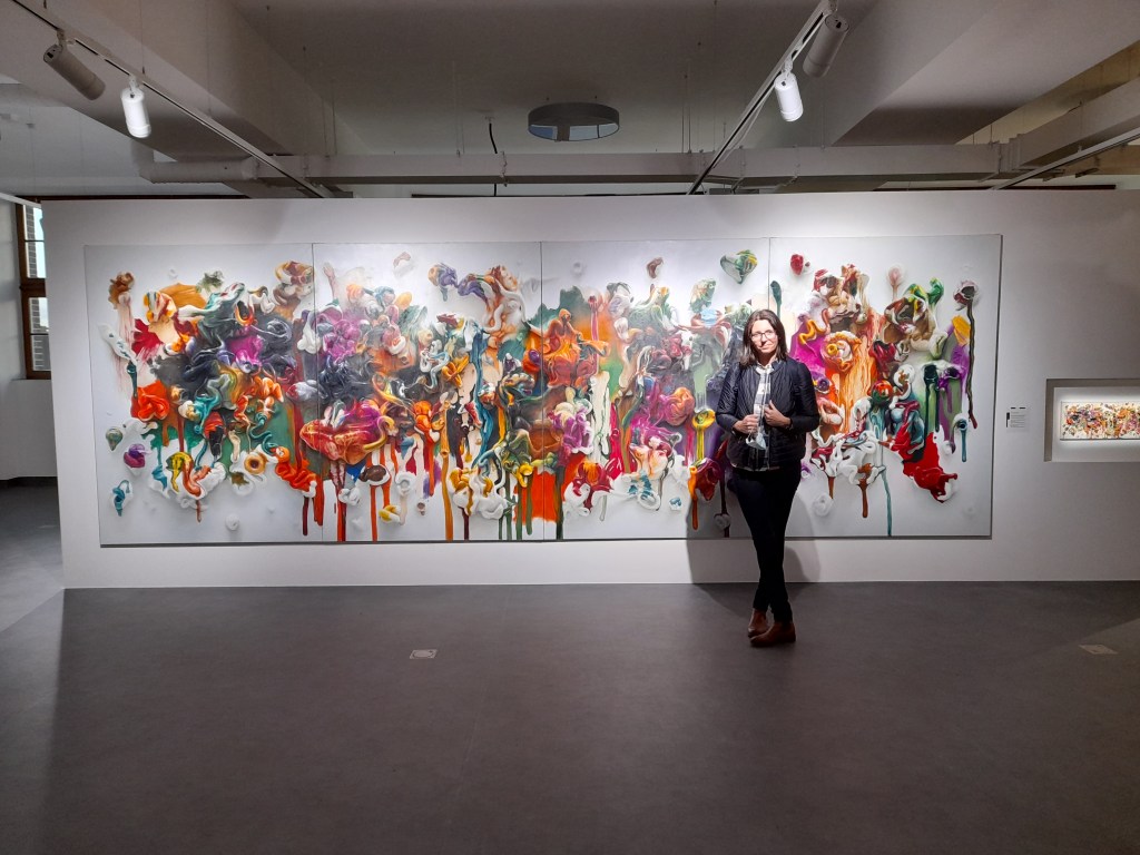 Homoiomerie – w filozofii Anaksagorasa zarodki wszystkich rzeczy, niepodzielne cząstki elementarne, poruszone boskim umysłem dają początek rzeczom. Pracy Marcina Zawickiego nie sposób w Nomus przegapić. Zasługa nie tylko w monumentalnych rozmiarach czy kolorystycznym przepychu, ale także umiejscowieniu na samym początku całej ekspozycji. Tak więc, kiedy złakniony sztuki współczesnej wdrapie się już na pierwsze piętro budynku, wejdzie wprost na panoramiczny fajerwerk Zawickiego i uwierzcie mi, na widok rozmachu dzieła, przegapi pandemiczny bezdech pod swoją maseczką. Pierwsze zaskoczenie już po minucie przedzierzgnie się w pociąg do tego, co na dziewiczej bieli płótna skrzy się swoim „byciem”. Krągłości lśniącej materii pysznie blikują światło, ciężarna substancja toczy swoje wszędobylskie nibynóżki. Wszystko jest tu syte i nachalne, w swojej bezforemnej potencji nawet zmysłowe. Żyje, czy raczej żyć dopiero się szykuje, ale, bez dwóch zdań, swoją witalnością już zaraża. Wspaniale, że obok płótna (na zdjęciu po prawej) można jednocześnie obejrzeć makietę stworzoną przez artystę jako wzór/model do tego dzieła. Podobne makiety to integralny element procesu twórczego artysty, w pewnym sensie jego znak rozpoznawczy. Na zdjęciu zasłaniam spory fragment pracy, ale z drugiej strony moja postać jest dobrym dla niej punktem odniesienia dla ukazania skali. Mała raczej nie jestem, ale dzieło jak widać jeszcze większe. (O innych pracach artysty miałam już okazję pisać w felietonach: Golem Marcina Zawickiego w Muzeum im. Przypkowskich w Jędrzejowie, oraz Holland & Poland)