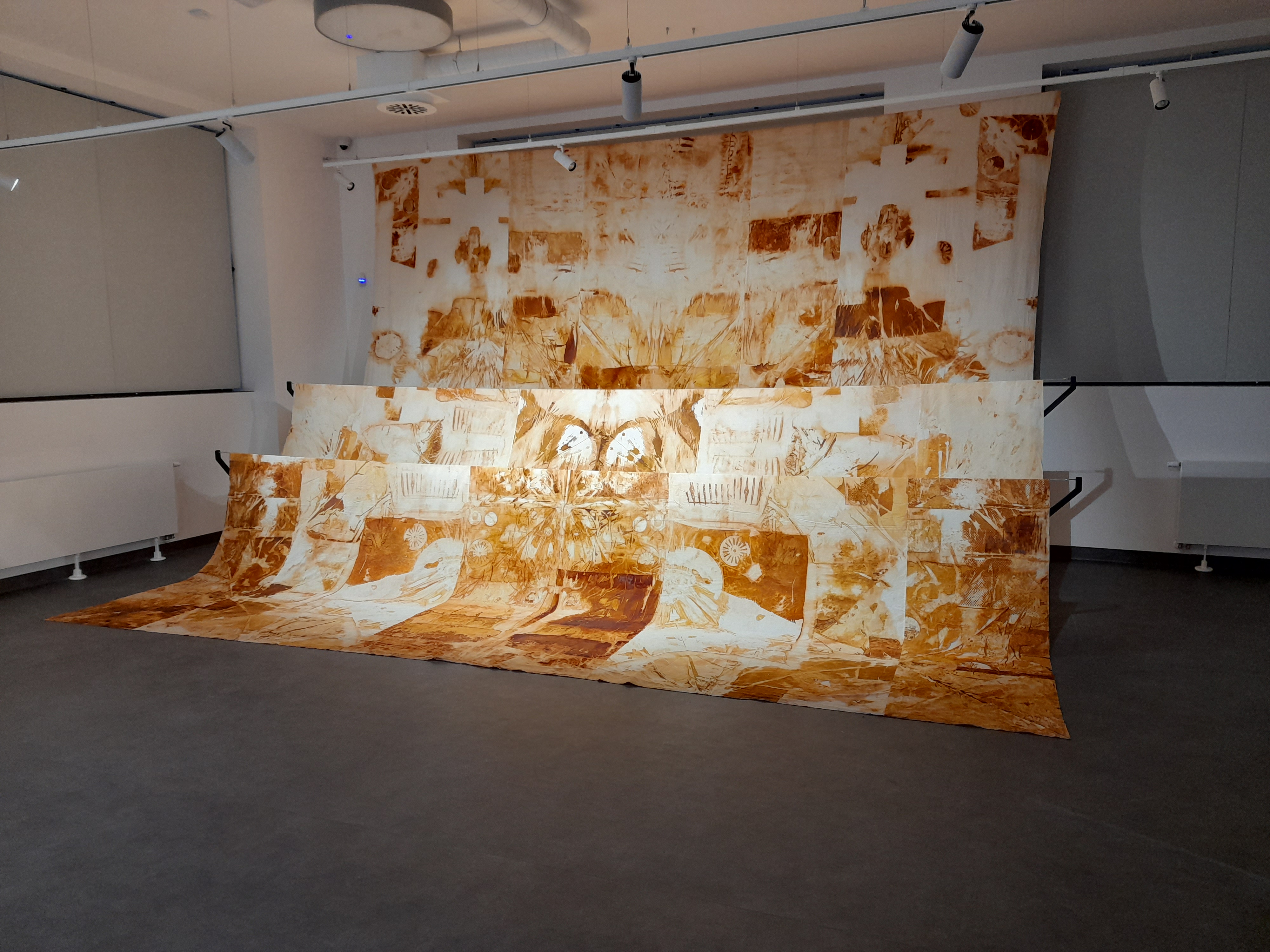 Pojedyncze źdźbło trawy i złożone ekosystemy, mikrokosmos bakterii i trajektoria układów gwiezdnych – wszystko to buduje pamięć, nie ta historyczna – usiana liczbami – ale ta rozpisana bardziej na filozofię i chemię. Pamięć komórkowa w łańcuchu chromosomów, immunologiczna, uzbrajająca w odporność, zapach przywołujący obraz, smak budzący emocje. Piszę o tym rodzaju zmysłów nie przypadkowo, bo w kontekście Anny Królikiewicz, malarki, scenografki, autorki instalacji, artystki wizualnej i artystki pokarmu. Jej twórczość opiera się o strategię resztek. Projekty, czasem niezwykle, jak zapach dyskretnie obecne, niosą to, co osobiste ale i publiczne, męskie i kobiece. Twórczość Anny Królikiewicz obraca się, jak mówi sama artystka, wokół pustki, nieobecności, kruchości pamięci i ciała. Ten rodzaj narracji odczytać można w wielu jej pracach (Stół, 2012 i Honey/Moon, 2015) i tę samą spotkałam także na gdańskiej wystawie. Praca Ślady proste jest, podobnie jak wspomniane wcześniej, nośnikiem sentymentu, kapsułą czasu. Jak proustowska magdalenka przechowuje przeszłość szerszą niż to, co napływa w pierwszej fali skojarzenia. Stoczniowe ułomki oddały tu w mgłę batystowej tkaniny ostatnie rdzawe tchnienie. Chłód metalu, roniąc resztki wewnętrznej energii, odcisnął portret minionego czasu, wysiłku, rozczarowań, zamierzeń. Tkanina Królikiewicz zagospodarowuje w Nomus ogromną przestrzeń, ale robi to lekko i wdzięcznie. Kołysząc wzrok kapryśnym rysunkiem przypadkowych wzorów staje się rodzajem sacrum, świeckiej relikwii, jakby całunu. Tuż obok w szklanej gablocie dojrzycie furoshiki. To mały tobołek wywodzący się z tradycji japońskiej, zawiniątko, a w nim książka, szkice i słowa klucze. To koncepcja Śladów prostych, która powstała w czasie żałoby artystki, jej choroby i szpitalnego odosobnienia. Tu, w zupełnie innej formie i mniejszych gabarytach, pamięć także znalazła swoją przestrzeń.