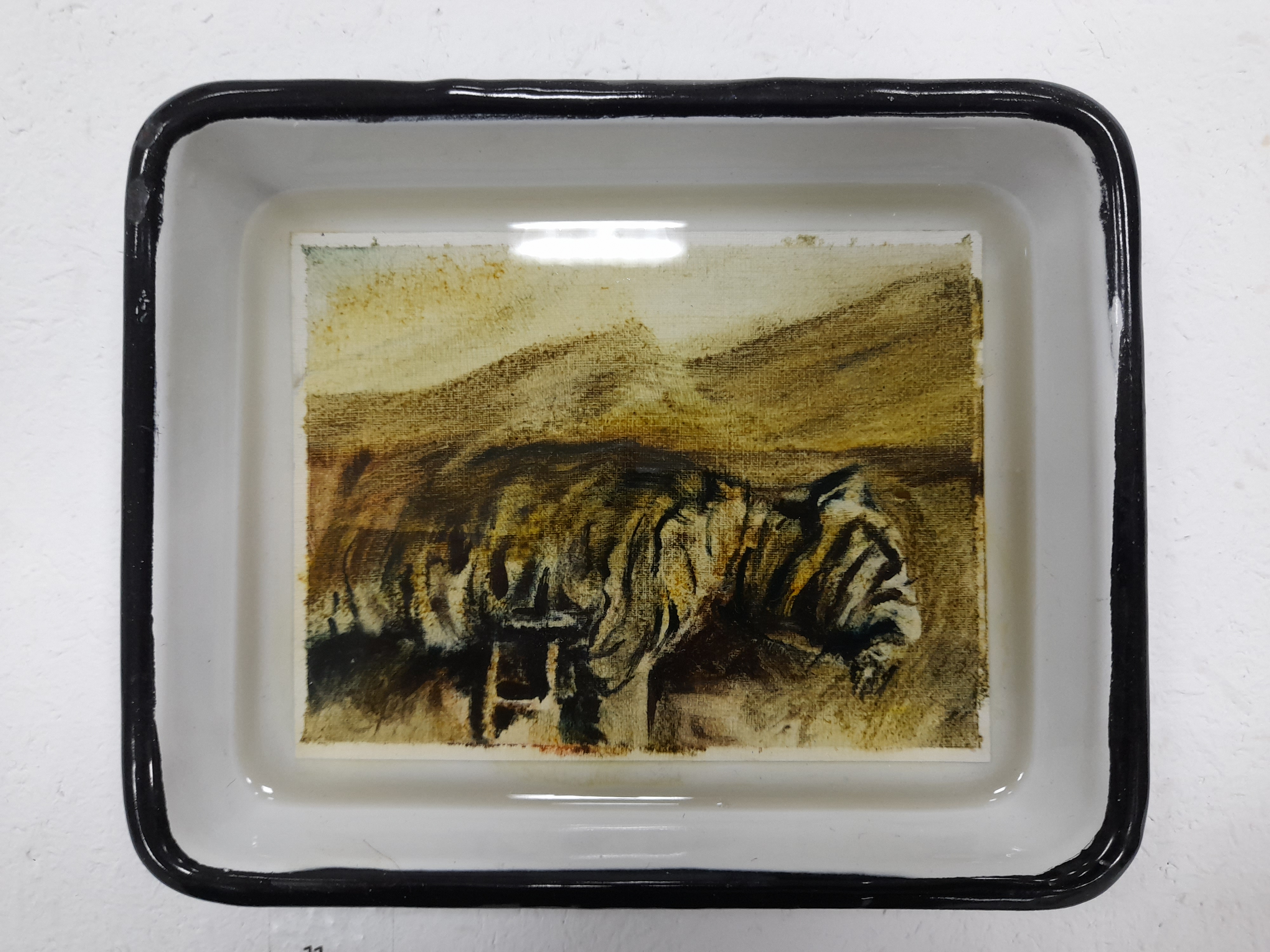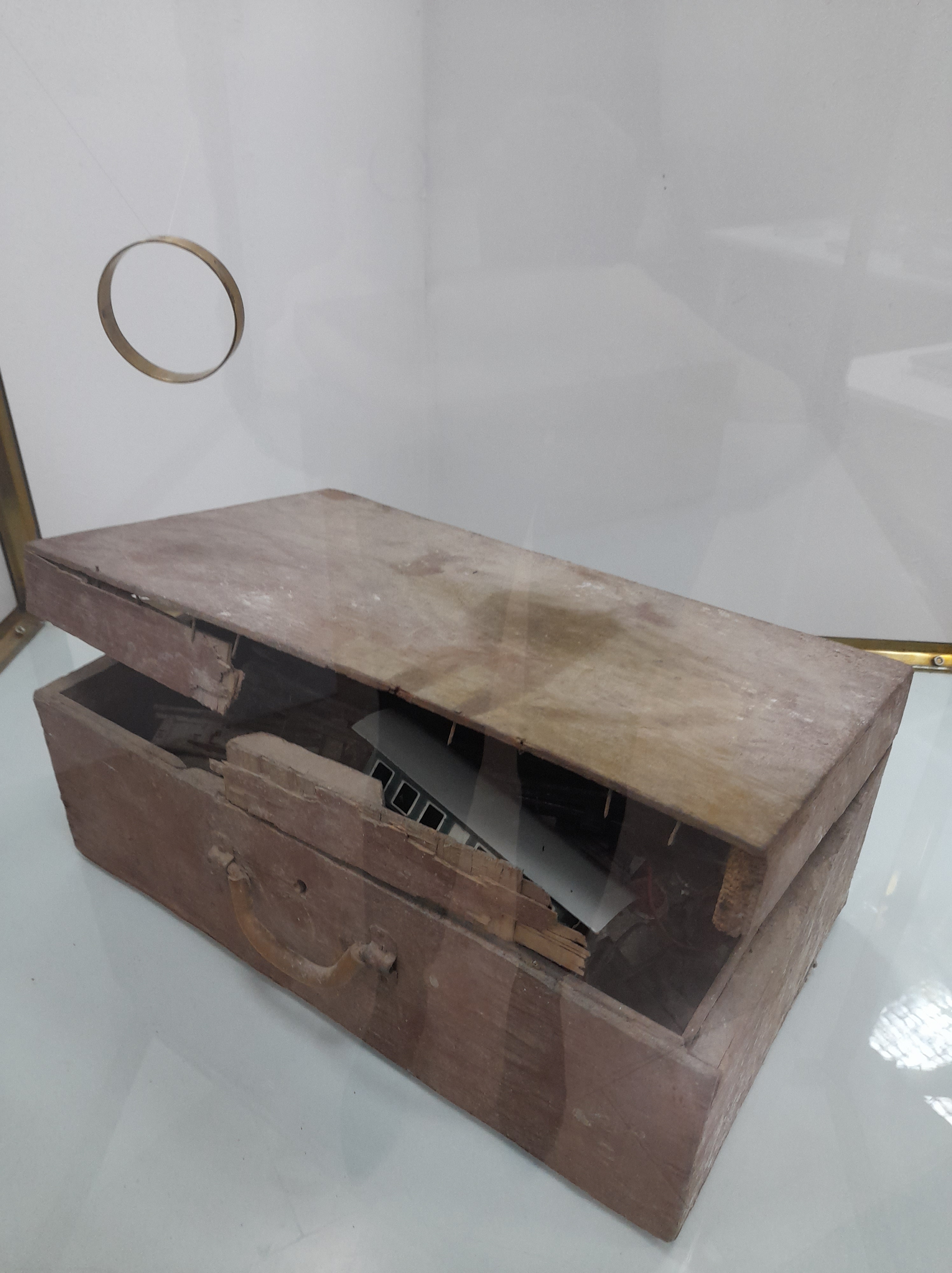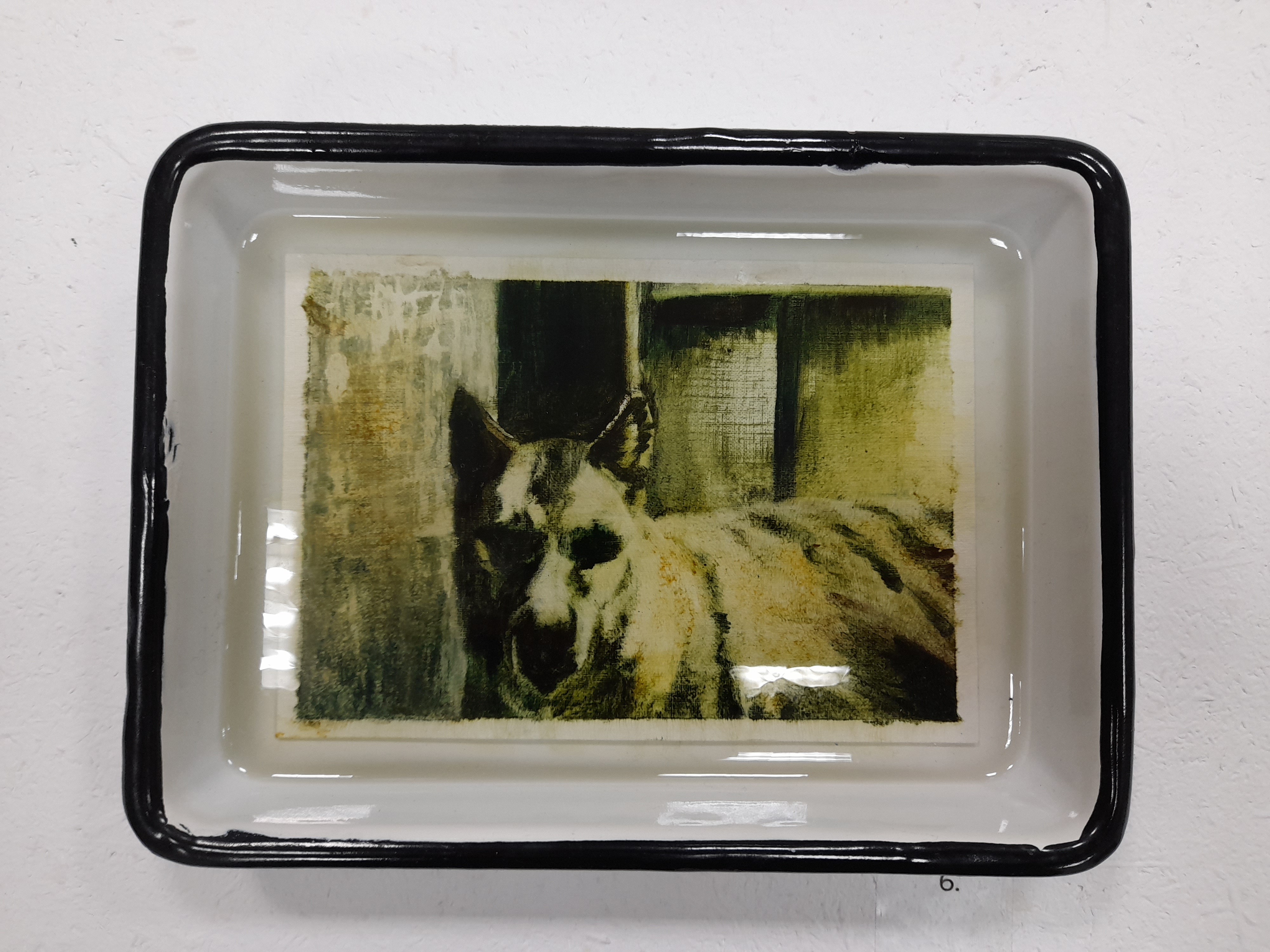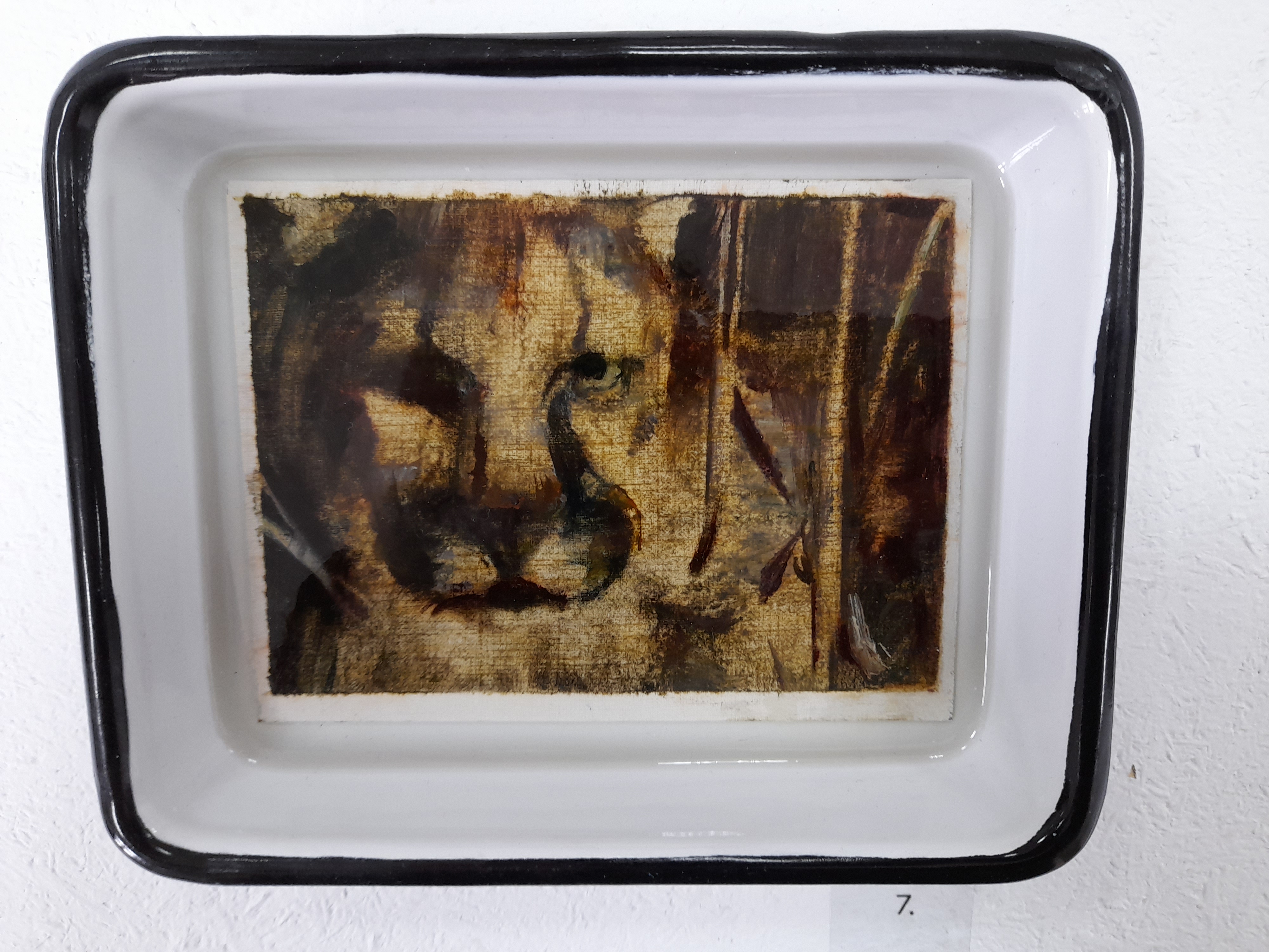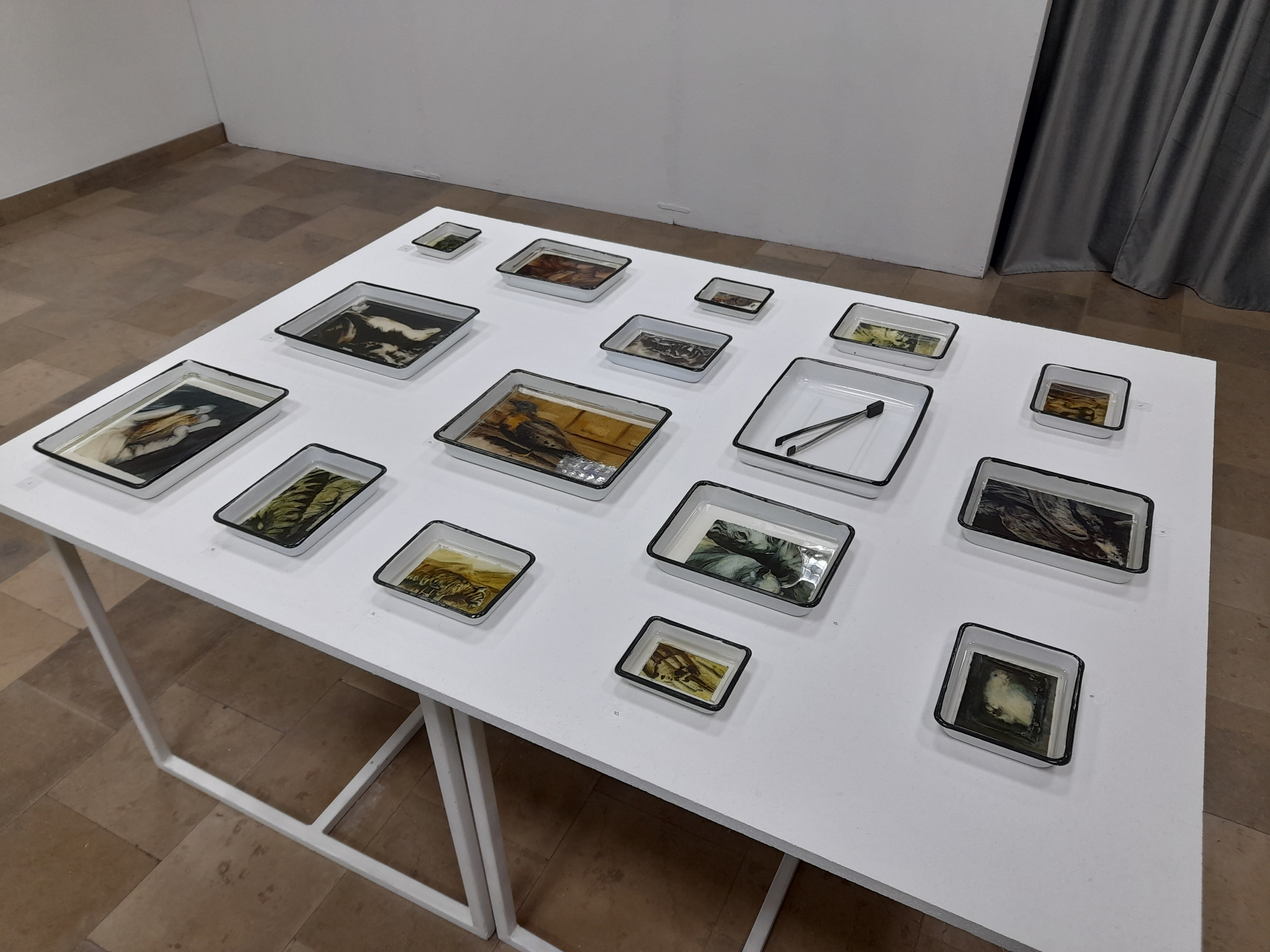 Stąd wzrokiem ogarniamy z jednej strony obiekt ready-made – umieszczoną w szklanej gablocie starą skrzynkę, pokrytą oryginalną, grubą warstwą kurzu z ukrytym w środku pociągiem-zabawką, z drugiej strony zaglądamy do fotograficznych kuwet z zanurzonymi w „cieczy” obrazami Michała Szuszkiewicza, współtwórcy wystawy – i co ważne nie tylko w kontekście prywatnym – męża Doroty Kozieradzkiej . Wszystkie jego obrazy przedstawiają ginące lub wymarłe gatunki zwierząt – te, których wizerunki i opisy podczas kwerendy w muzeum artysta odnalazł m.in. w bibliotecznych zbiorach i które w ten sposób symbolicznie przywrócił do życia. Owe duchy z przeszłości Szuszkiewicz „wywołuje” – jakby dosłownie i w przenośni – w paradoksalnym geście traktując obraz jakby był fotografią (..) bo też tylko za pomocą malarstwa może cofnąć czas i zrobić zdjęcia istot, których już nie ma.
