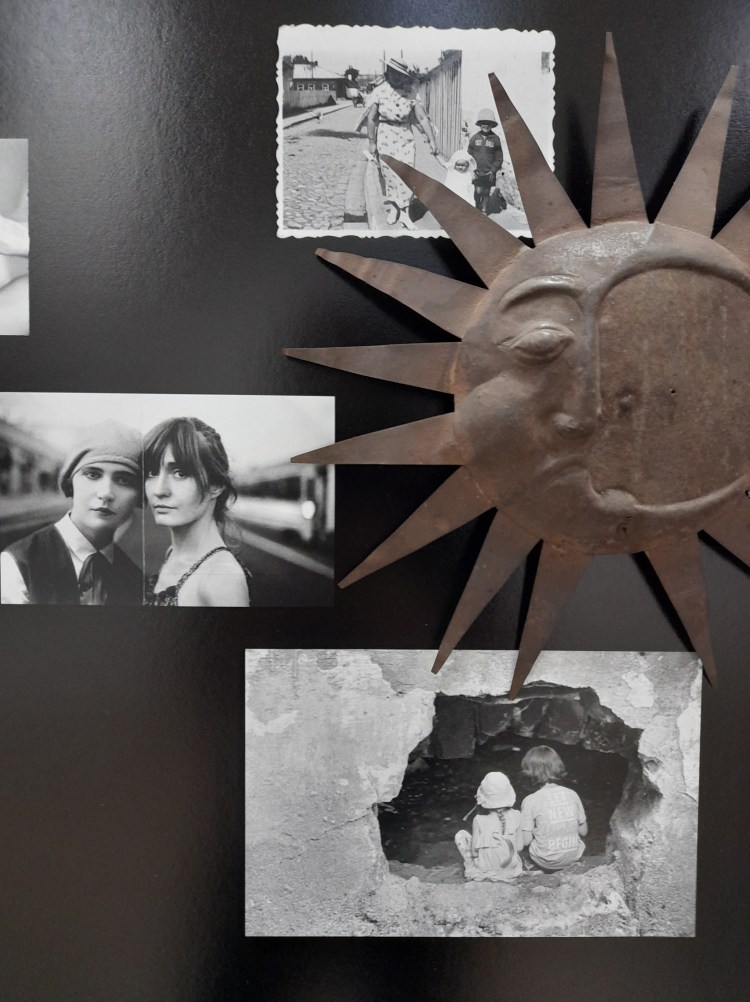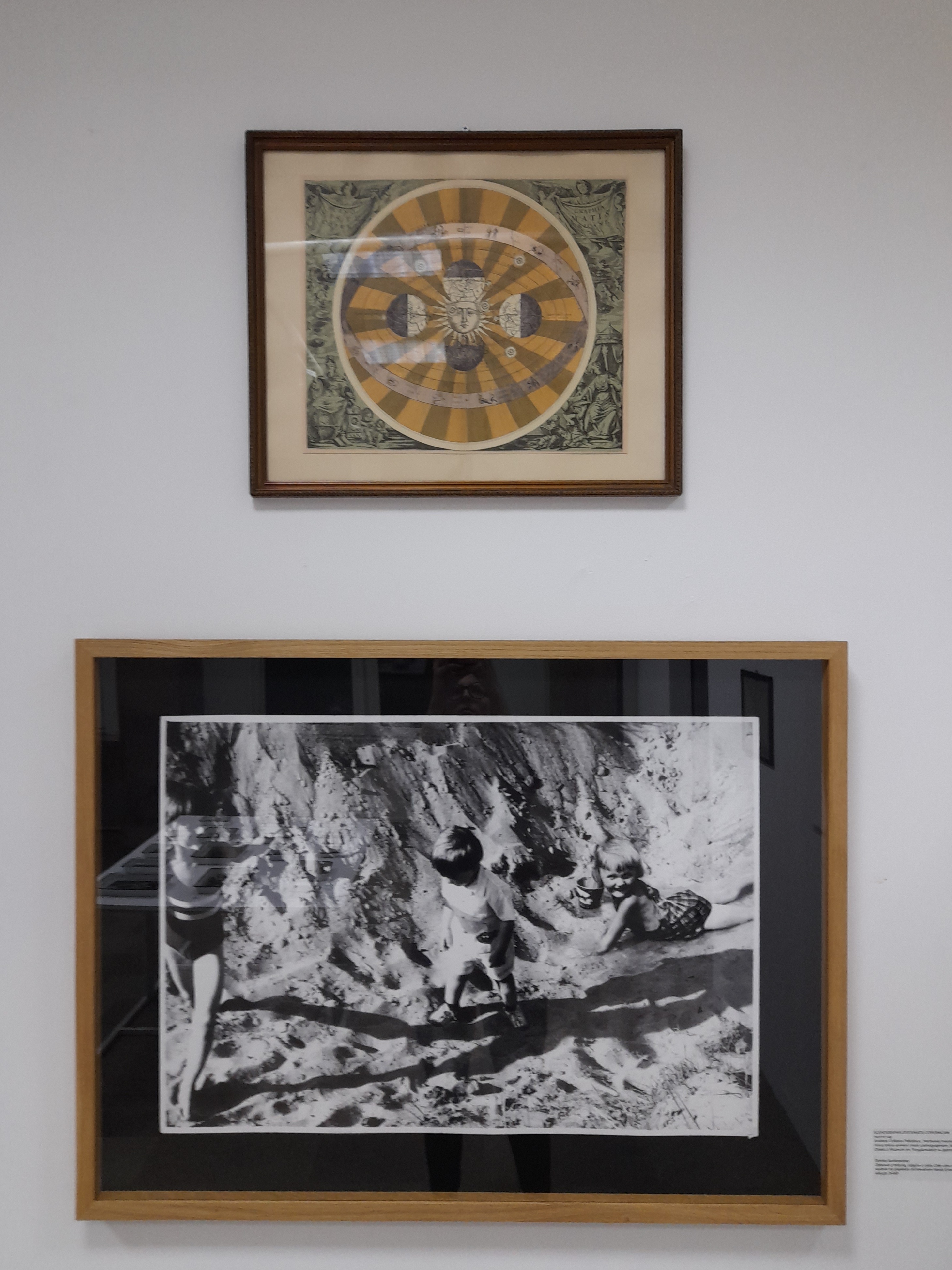 Jest to także nawiązanie do tkwiącej korzeniami w starożytności figury czasu cyklicznego, w którym wszystko, jak pory dnia i roku, zawsze powraca. W tym kontekście czytelnym staje się zabytkowy emblemat Słońca umieszczony w centralnym punkcie instalacji witającej wchodzących na wystawę. Na czarnym tle wyraźnie odcinają się tu zdjęcia członków rodziny artystki tworzące rodzaj gwiezdnej konstelacji. A ponieważ – czas w perspektywie filozoficznej jest (…) wytworem świadomości żywej istoty, która przeżywa czas za pośrednictwem pamięci, historii, a także doświadczeń zmysłowych (tekst kuratorski) – w fotograficznym cyklu Kozieradzkiej Cały czas wokół mnie (2022), który w Jędrzejowie oglądamy punktem centralnym jest ona sama. To artystka pozostaje tu gwiazdą, wokół której poruszają się pokolenia minione i przyszłe wzajemnie przenikając swoje trajektorie bytu.