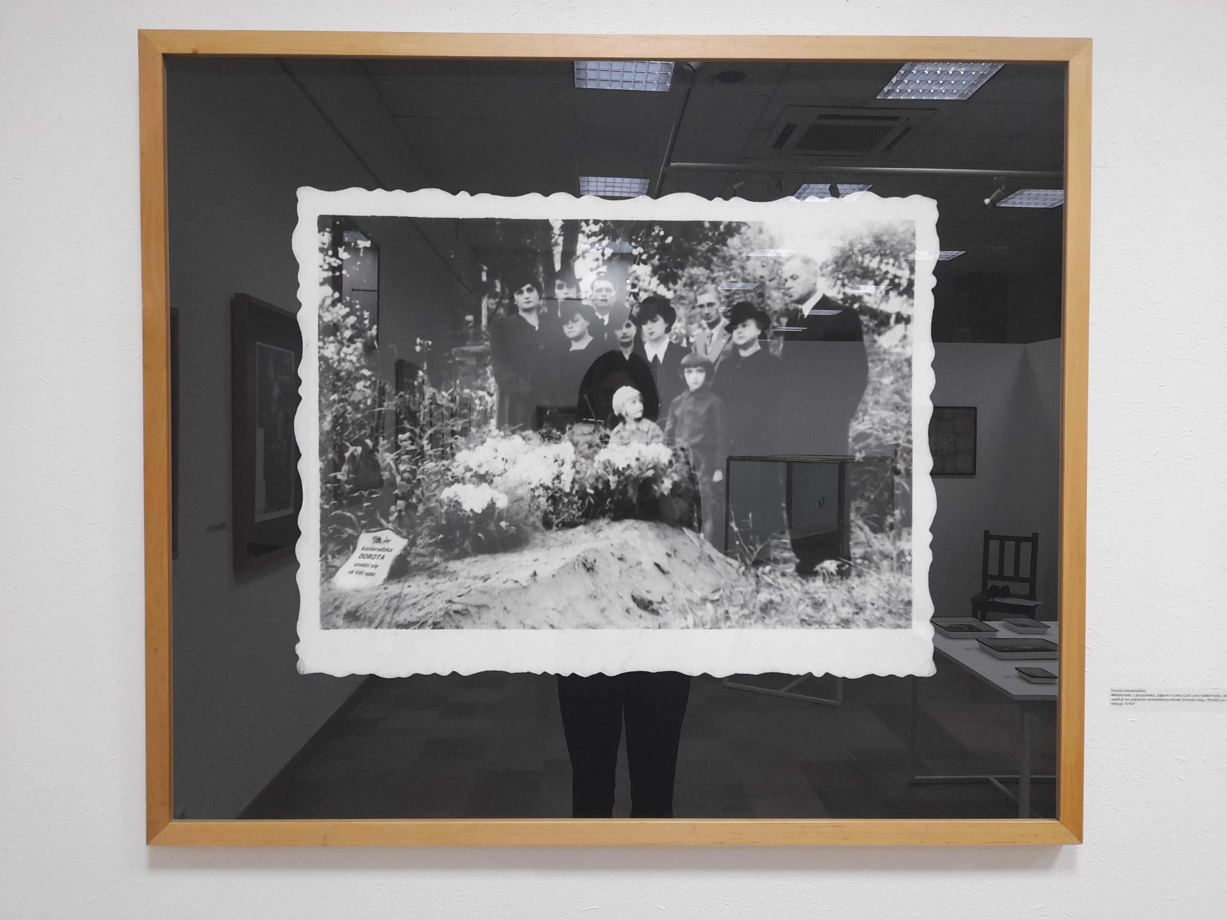 Na koniec jeszcze z tej samej perspektywy krzesła wykonać można ekwilibrystykę najwyższych lotów. Oto w wielkoformatowym zdjęciu widocznym na przeciwległej ścianie grupka ludzi stoi nad świeżo usypanym grobem. Na kopczyku wyraźnie odcina się blacha w charakterystycznym cmentarnym kształcie z przewrotnym afirmatywnym napisem Kozieradzka Dorota urodzi się 28 VIII 1982.