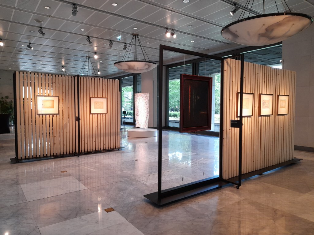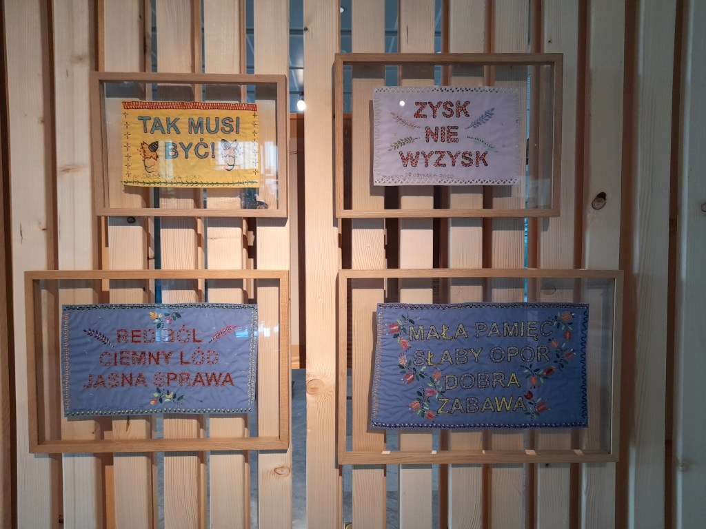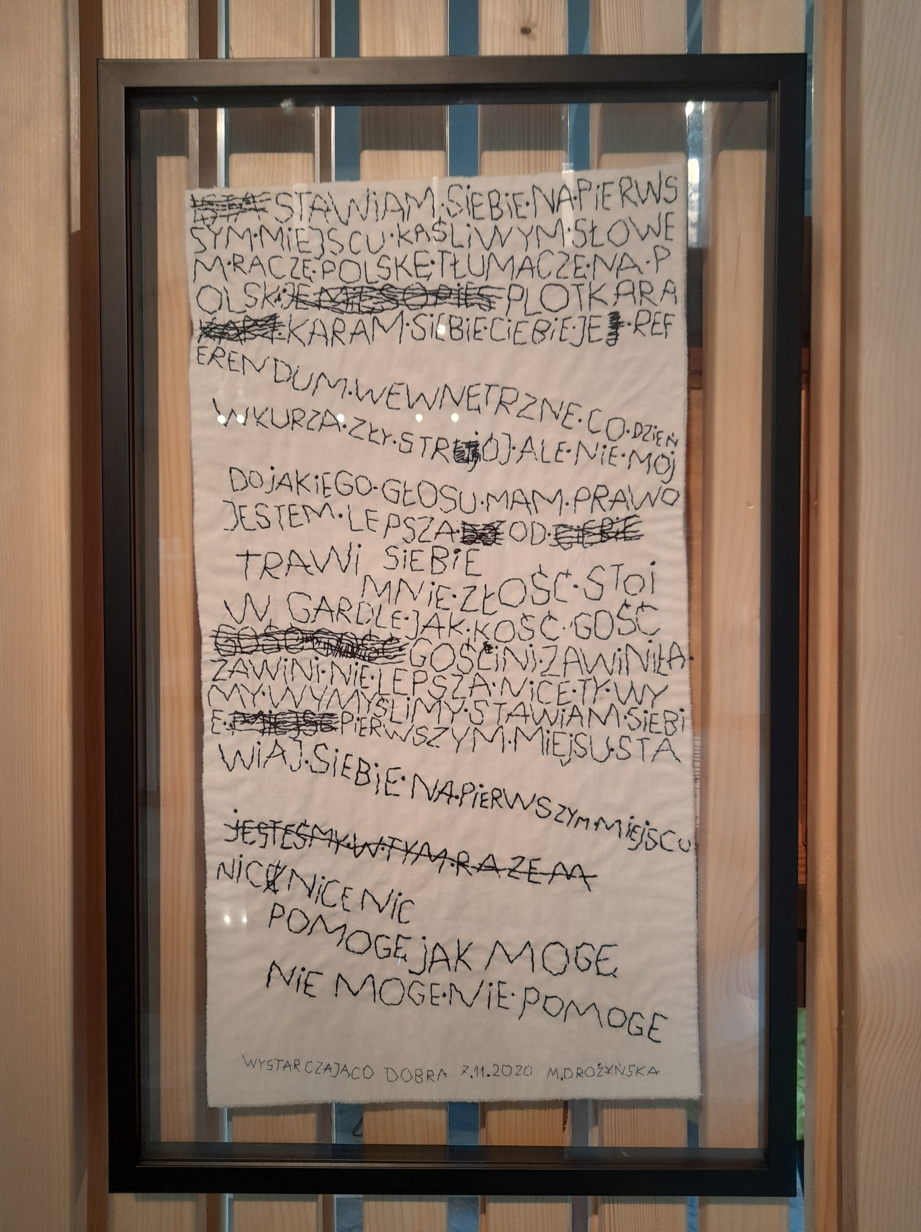 Zmagając się z inspirującą, ale też dla mnie trudną kuratorską koncepcją tej wystawy pomyślałam, że obie artystki pozostają nadzwyczaj bliskie demonom swoich czasów. Erna Rosenstein, z bagażem wspomnień z lwowskiego getta i tragicznej śmierci rodziców, podobnie jak większa część jej środowiska i pokolenia przepracowywała w swojej twórczości traumę wojennego doświadczenia. Równie mocno wyczulona na puls tego co „tu i teraz” jest Monika Drożyńska. Tematami swojej sztuki czyni problemy kondycji współczesnego człowieka, porusza wydarzenia społeczne i polityczne. Jednocześnie do twórczości obu artystek zakrada się czułość, wrażliwość i jakby rodzaj miękkiego serca. Czarne Przez szpary z 1974 r. Erny Rosenstein straszy, ale jej różnokolorowe Linie na jasnym tle z tego samego roku, już raczej cieszą oko. Podobnie kojąco działa w pracy Drożyńskiej zmultiplikowane słowo miło choć wciśnięta na jej końcu Ość (2017) bez litości ściągnie każdego romantyka na ziemię.