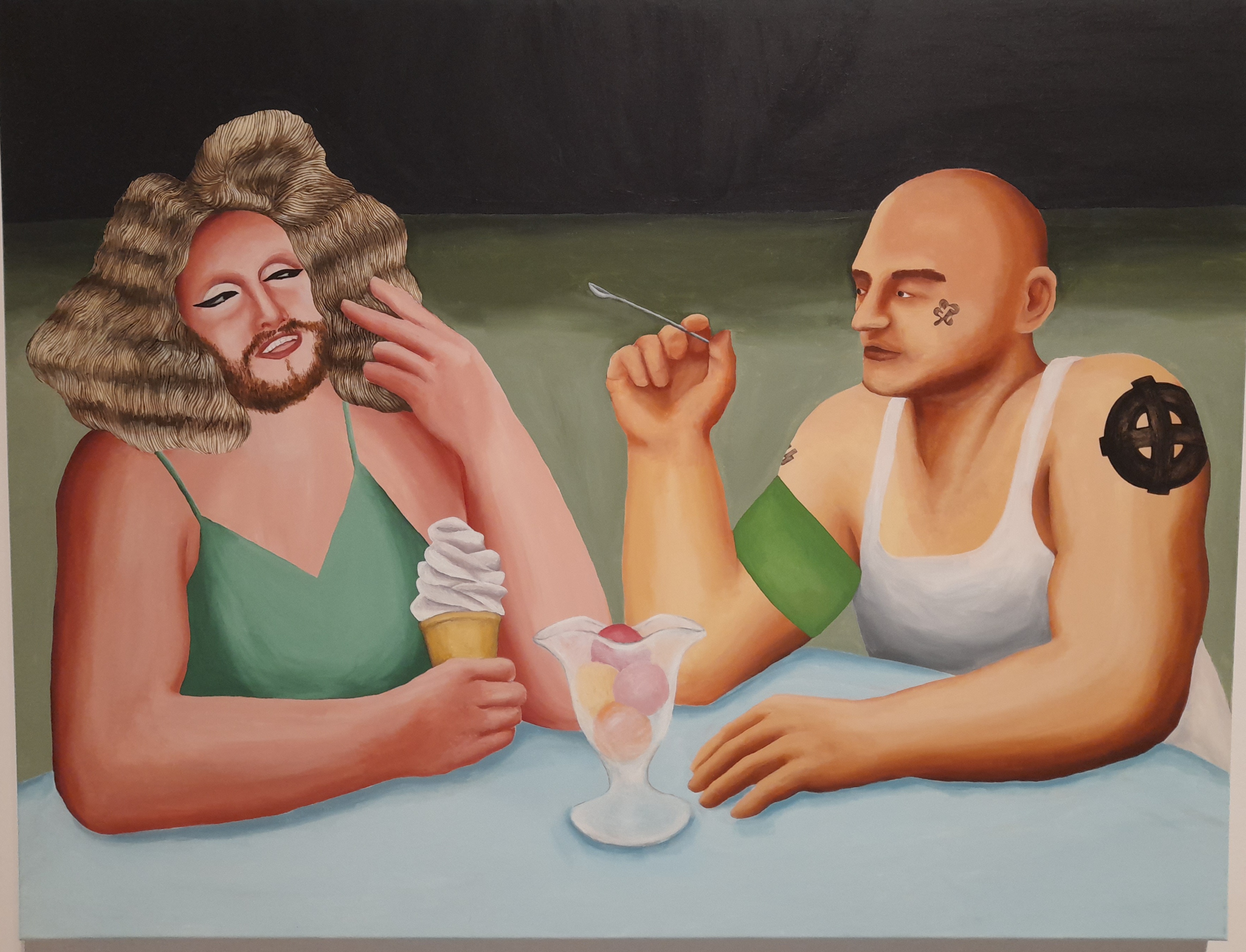 Jednak pole zainteresowań kobiet, podobnie zresztą jak mężczyzn, sięga dalej, poza granice rodzinnego podwórka. Społeczne napięcia i konflikty są przez nie pilnie śledzone. Ba! Artystki-aktywistki stają się bezpośrednimi uczestniczkami tych wydarzeń i ich prowodyrkami, pozostają papierkiem lakmusowym pilnej potrzeby wszelkich zmian w patologicznym układzie patriarchalnym – wystarczy spojrzeć na prace Anny Grzymały Zdejmij mundur przeproś matkę czy ONR-owiec konsumujący krem sułtański z osobą niebinarną, 2021.