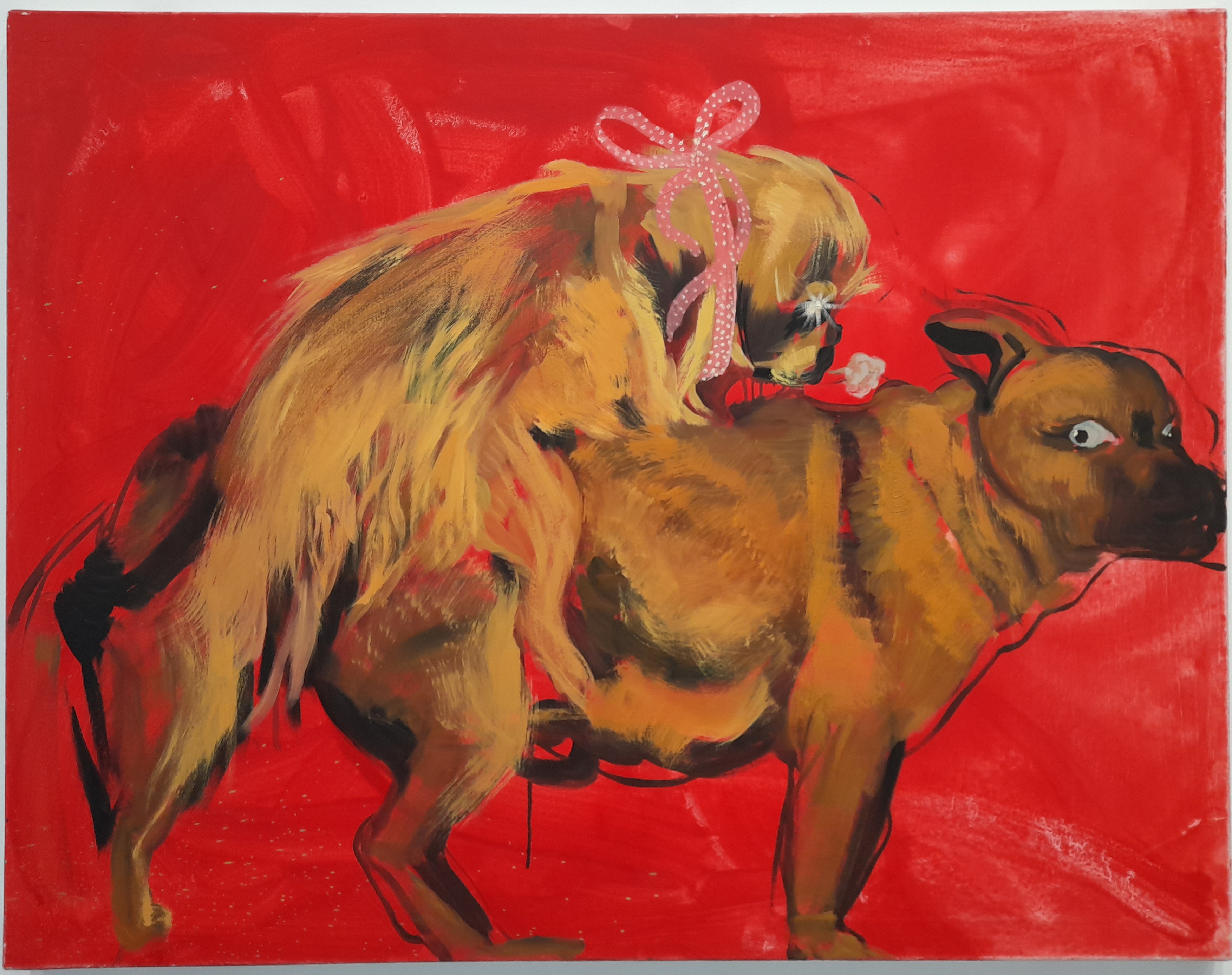 Tuż za rogiem kolejnej sali nadziewamy się jeszcze na najprzedniejszy żart i cudowną lekkość niczym nieskrępowanego rozpasania erotyczną rozkoszą (Alex Urban, Suczki, 2022, Katarzyna Kukuła, Torcik, 2011, Pasja. Rygunia rucha Berka, 2017, Ludmiła Woźniczko, bez tytułu, 2011).