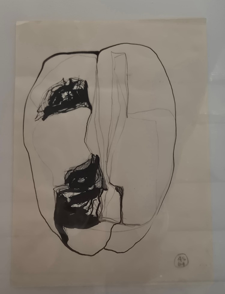 Obła forma pozwala na kilka różnych interpretacji. W abstrakcyjnym kształcie dostrzec można przedstawioną en face twarz ludzką lub nawet dwie, ukazane z profilu i trwające w namiętnym pocałunku. Kolejny trop podpowiada czas powstania rysunku. W roku 1961 artystka pracowała nad rzeźbą „Przemiany”. Niektóre szkice do tej pracy aluzyjnie nawiązują do formy waginalnej, a w ich wnętrzu pojawia się kształt kojarzący się z ustami. W odróżnieniu jednak od tych szkiców, jak i kamiennej rzeźby rysunek prezentowany na wystawie skomponowany jest wertykalnie, co utrudnia jego jednoznaczne powiązanie ze wspomnianym zrealizowanym projektem.