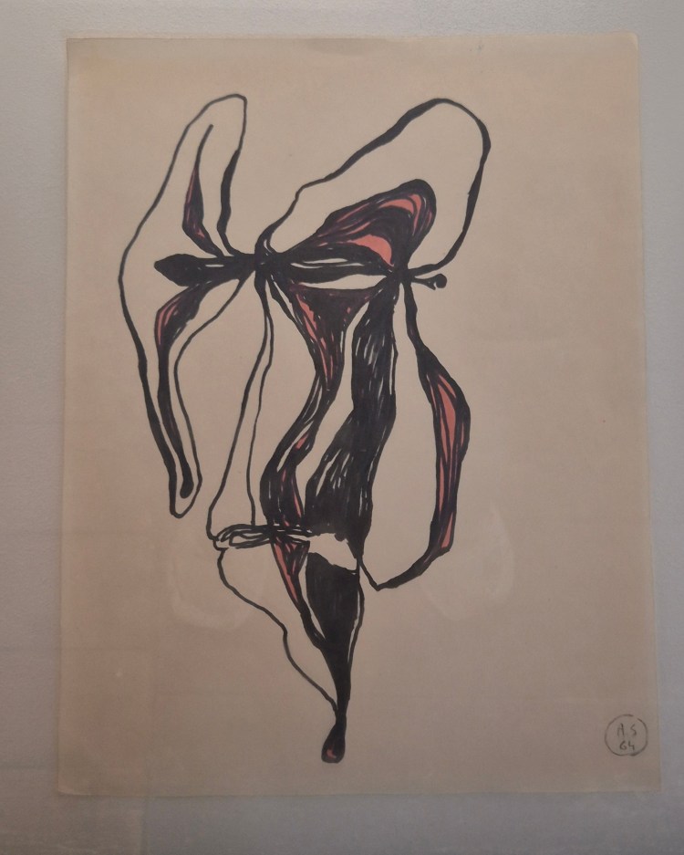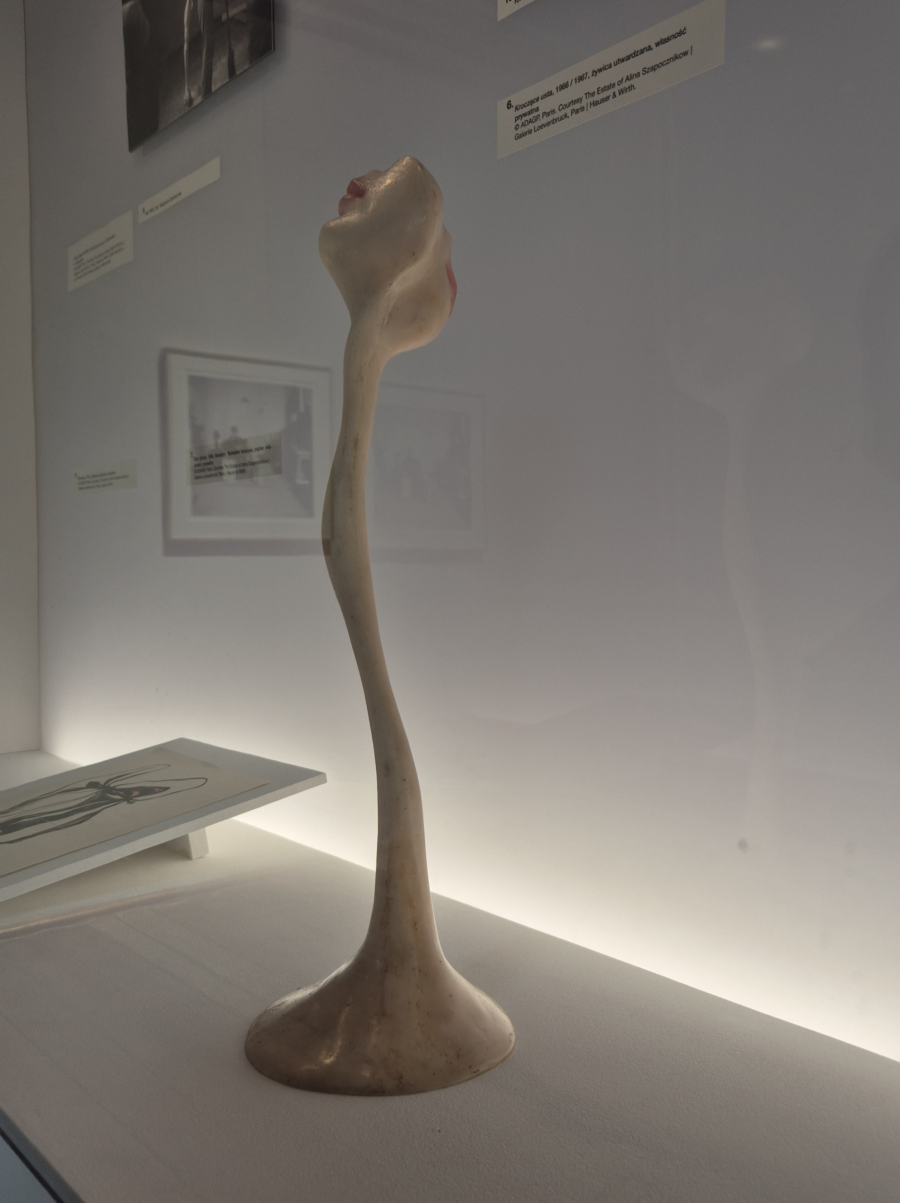 Abstrakcyjna forma swoją masywnością tchnie siłą i powagą. Mocno zaznaczony kontur wydaje się sugerować kształt męskiego torsu. Szerokie ramiona wieńczy nie głowa, a struktura przypominająca żołądź penisa. Choć artystka swoje zainteresowanie kierowała głównie w stronę ciała kobiecego, motyw ten pojawił się w jej twórczości kilkakrotnie, jak np. w poliestrowej rzeźbie „Szalona biała narzeczona” z 1971 roku. Świetnym komentarzem do rysunku prezentowanego na wystawie jest wypowiedź rzeźbiarki Barabary Falender:[Szapocznikow] ma niezwykłą swobodę, lekkość przedstawiania wizji, taką prawie małpią zdolność do rysowania. Ona nie drapie, nie wyciera, nie mędzi… to jest odważna, nie zatrzymująca się kreska. (…) Tu nie zawsze jest obecna rzeźba, ale zawsze myślenie o rzeźbie.
