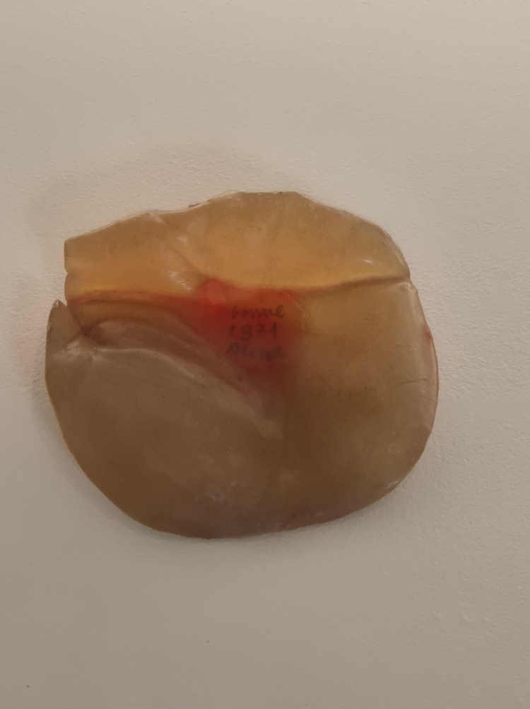 Odlew dłoni Aliny Szapocznikow wykonany w niebarwionym poliestrze. Wewnątrz znajduje się różowa karteczka z życzeniami „Szczęśliwego Nowego Roku 1971”. Tego typu obiekty artystka wykonywała i wręczała osobom, którym odwdzięczała się za ich wsparcie. Odcisk dłoni był prezentem dla przyjaciela rzeźbiarki, architekta Zbigniewa Parandowskiego.