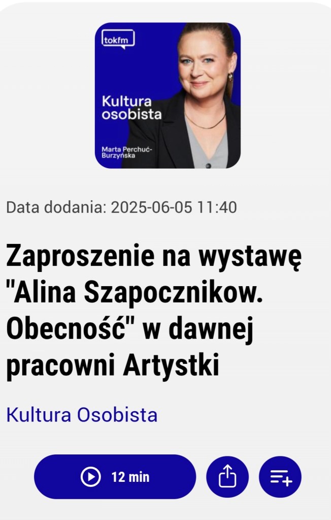 Katarzyna Sanocka w rozmowie z Dorotą van Vugt z Fundacji Alina i Moniką Przypkowską kuratorką wystawy „Alina Szapocznikow. Obecność” dla „Rozmowy po zmroku” / Dwójka – Program 2 Polskiego Radia