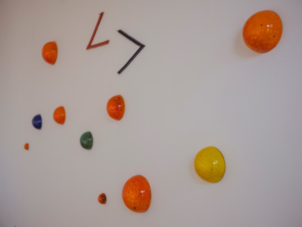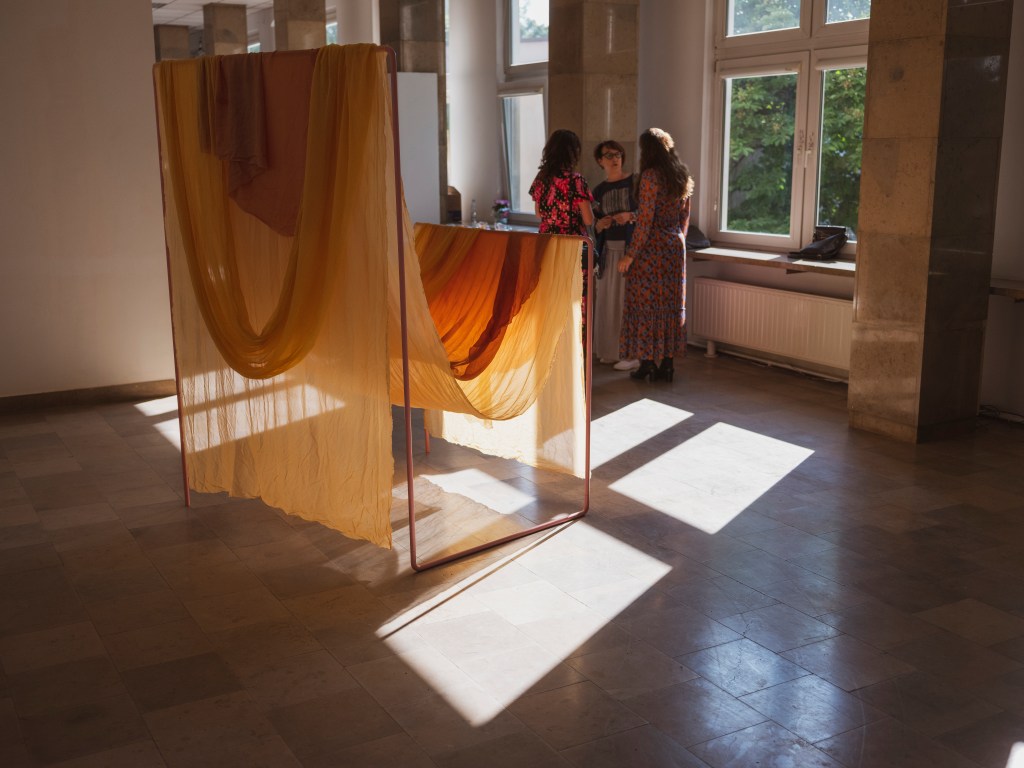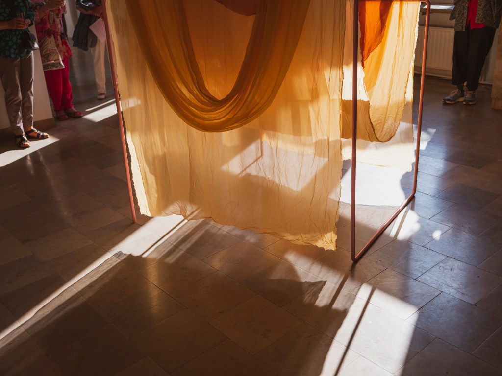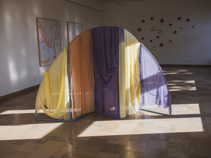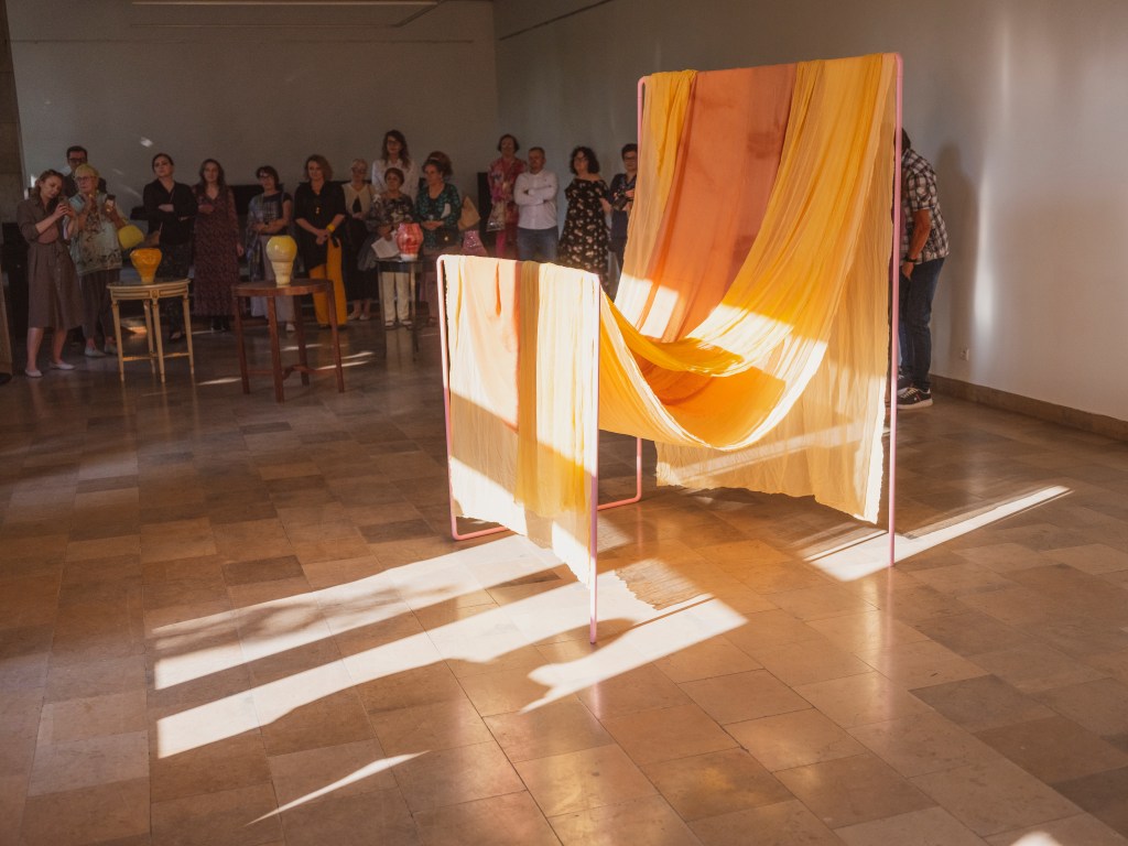 Jak w każdej kosmografii, mikro-wszechświat Bielawskiej posiada także swój gwiezdny zwornik – Słońce. Mieniące się ciepłymi barwami tkaniny i szkliwa stworzonych ręką artystki pomiętych, ceramicznych wazonów są niczym materialny znak pogańskiej epifanii światła. Alchemiczną moc promieni przywołują tu także zawieszony na ścianie galerii ceramiczny gnomon i rozmieszczone na kolistych trajektoriach kolorowe półsfery, a życiodajność Słońca odbija się wachlarzem kolorów w parawanach z tkanin barwionych cebulą, wrotyczem, czarnym bzem i świerkiem. W kosmicznym uniwersum Bielawskiej cykl życia możemy zobaczyć w perspektywie rzeczy, natury i nas samych. W konstrukcji wystawy artystka uczyniła z ludzkiej figury ważny punkt odniesienia, metrum proporcji dla niemal wszystkiego, co dookoła. Człowiek nie jest tu jednak miarą wszechrzeczy – lecz zaledwie i aż – jej częścią składową. Dlatego w siatce linii integrujących wystawę czeka na publiczność nie pułapka, lecz namysł nad czasem, pamięcią, rzeczami i światłem, które w nas i obok nas bytują.