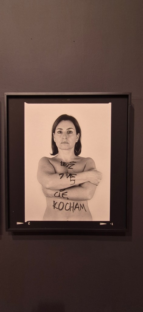 Scenografia wystawy jest materialnym przedłużeniem mentalno-lingwistycznej pułapki tych kompozycji. Ściany, na których zawieszone są płótna, nie przeszkadzają publiczności, ale wyraźnie kierują jej przepływem. Ich wysokość oraz intensywność powtarzającej się na nich treści przyciągają i przytłaczają jednocześnie. To polskość oglądana z perspektywy rejtanowskiej podłogi. Nie da się jej przeoczyć, przeskoczyć ani uciec od niej, trzeba się z nią zmierzyć.