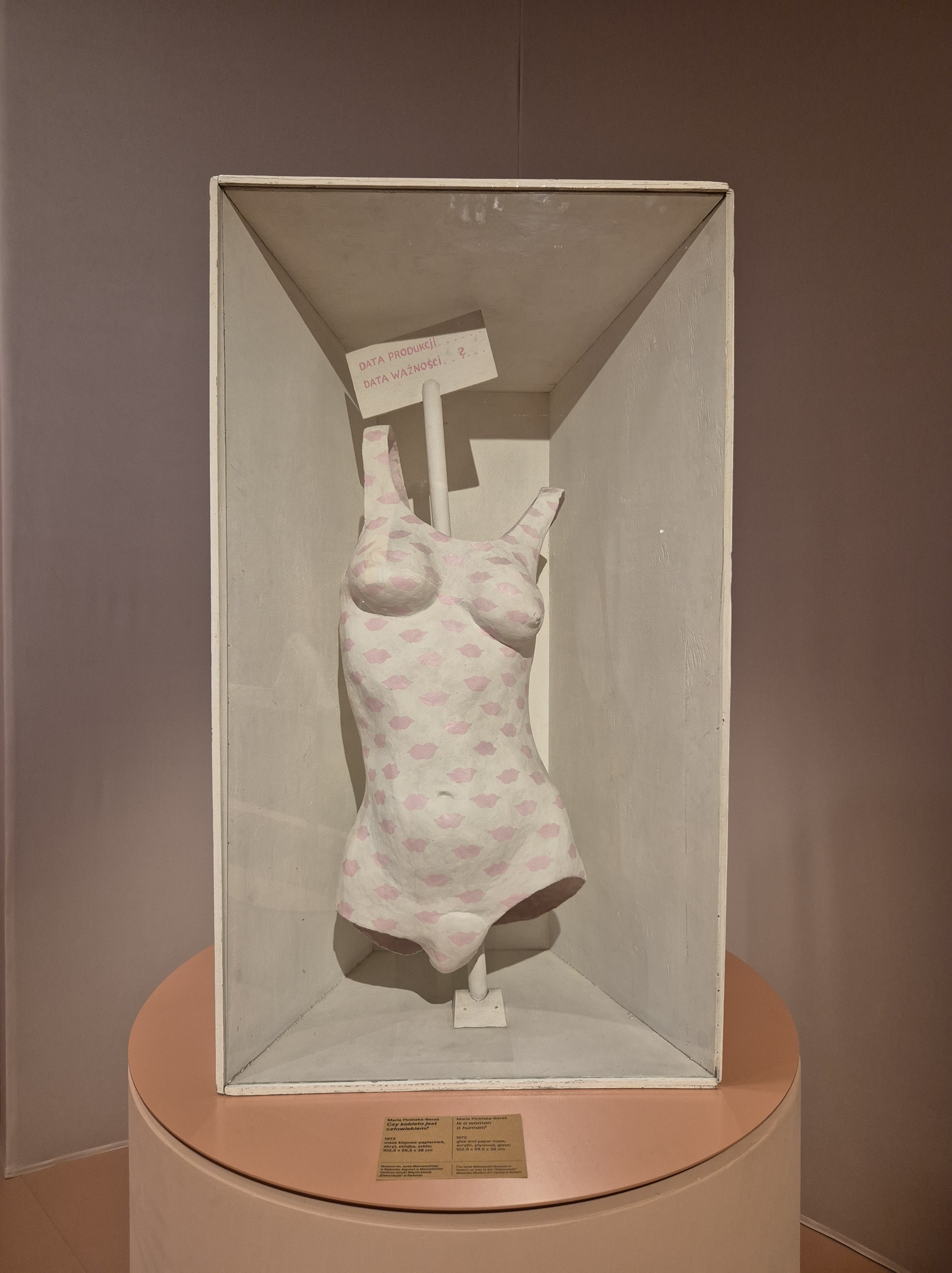 Analizując tę pracę, Agata Jakubowska wskazała na konieczność powiązania jej interpretacji z uzyskaniem przez kobiety w latach 60. większej swobody kulturowej, co objawiło się m.in. szalenie modnym i zaakceptowanym dość szybko fasonem minispódniczki. W czasach narastającego globalnie konsumeryzmu, obecnego do pewnego stopnia także w krajach socjalistycznych, odsłonięcie kobiecych nóg stało się wtedy furtką do zaprzęgnięcia ciała kobiecego w służbie masowej konsumpcji. Odsłonięte zęby, brzuchy i biusty kobiece sprzedawać zaczęły kosmetyki, tekstylia czy sprzęty domowe. Rynkowa wymiana dóbr automatycznie czyniła z ciała kobiety przedmiot, a nie podmiot sytuacji.21 Przeciwstawiając się temu wyidealizowanemu i z gruntu fałszywemu obrazowi dominującemu w sztuce i mediach następnej dekady, ówczesne historyczki i krytyczki sztuki zaczęły promować pokazywanie naturalnego kobiecego ciała, niepoddanego kulturowej obróbce. Do tych kwestii Maria Pinińska-Bereś odniosła się m.in. w swojej pracy Czy kobieta jest człowiekiem? z 1972 r. Widać tu kostium kąpielowy, czy może raczej sfragmentaryzowany tors kobiecy, z podaną datą produkcji i ważności. Wystawiony w strukturze przypominającej sklepową witrynę poddany jest wizualnej konsumpcji. Co ciekawe, ten mocny i wyrazisty przekaz, w niemal zabawnej, słodko-puddingowej formie, zbiegł się w czasie z programem telewizyjnym Ways of Seeing wyprodukowanym w tym samym roku przez BBC. Jego pomysłodawca i prowadzący – brytyjski krytyk sztuki, pisarz i malarz John Berger, w kolejnych odcinkach stawiał pytania związane ze sztuką i jej postrzeganiem, wprowadzając także temat prezentacji kobiet w sztuce, przemyśle rozrywkowym i reklamie jako biernych obiektów do zobaczenia. Uwarunkowane historycznie przedstawianie kobiet z męskiej, heteroseksualnej perspektywy i dedykowanie męskiej heteroseksualnej widowni zyskało w 1975 r. dzięki angielskiej reżyserce i medioznawczyni Laurze Mulvey swoją nazwę jako male gaze (męskie spojrzenie) i przywoływane jest w feministycznym nurcie intelektualnym do dzisiaj. Jak widać, po obu stronach żelaznej kurtyny rodziła się wspólna świadomość pewnych zjawisk i nowego ich dyskursu.