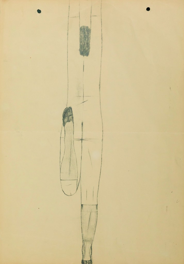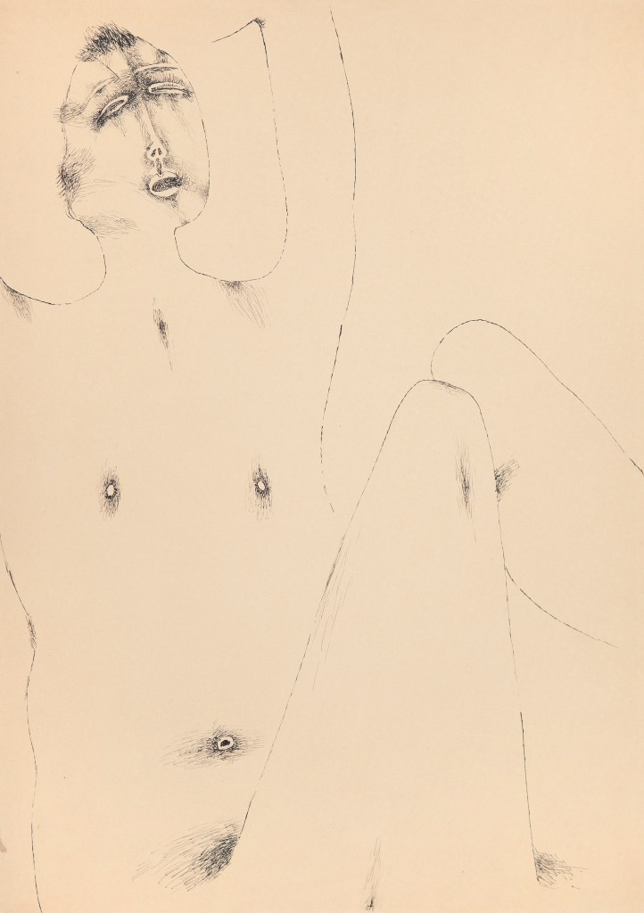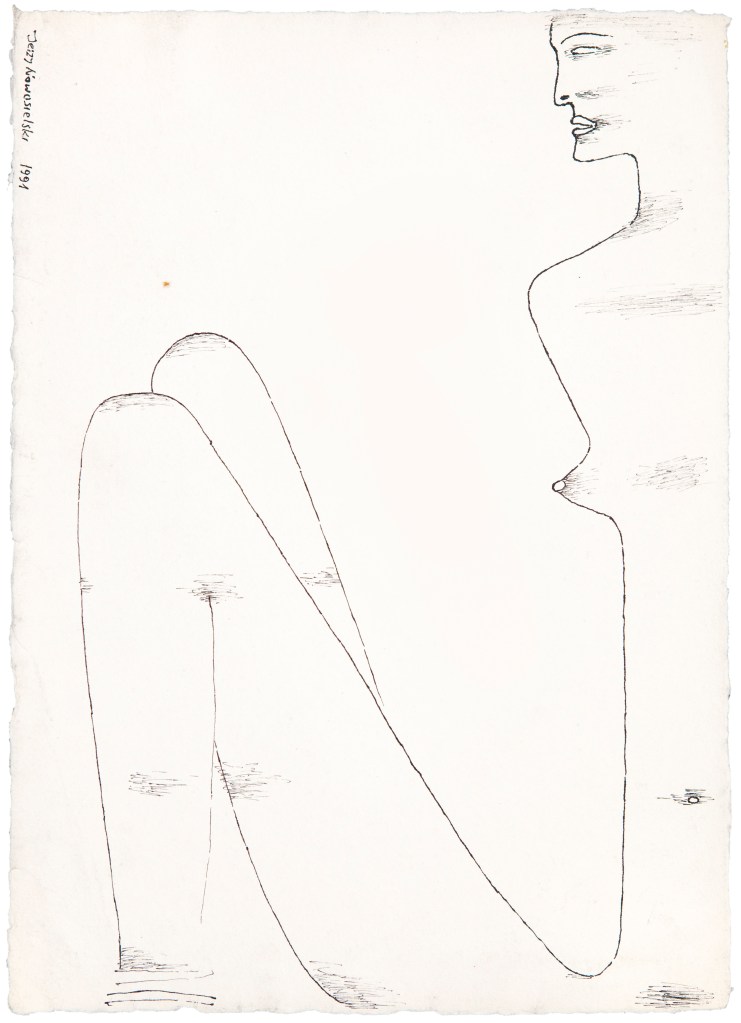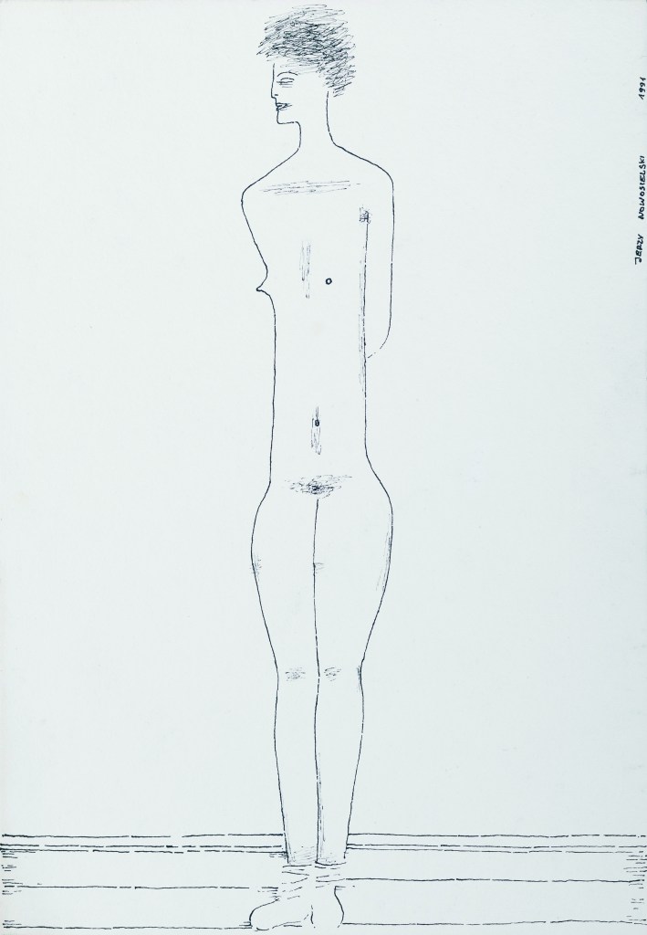 Ta „skażona zmysłowość” – jak zdefiniowała ją Krystyna Czerni – wynikała z młodzieńczego doświadczenia nagości przede wszystkim w odniesieniu do wojennego, okupacyjnego, upokorzonego i martwego ciała. Była to pamięć ciał wywożonych z likwidowanego lwowskiego getta, które mógł widzieć, gdy podczas nowicjatu studiował ikonopisarstwo w unickiej Ławrze Uniowskiej św. Jana Chrzciciela w Uniowie pod Lwowem, może wspomnienie rozebranych kobiet z obozu w Prądniku, gdzie trafił pod koniec okupacji lub też powielenie relacji prasowych z powojennych publicznych egzekucji. Nawet jeśli jednak rozpatrywać tzw. rysunki sadystyczne Nowosielskiego jako powidok wojennej traumy, nie sposób pominąć w ich interpretacji surrealistycznego zaplecza artysty. To ono ośmielało go, by bez zahamowań, choć jedynie w wąskim kręgu przyjaciół, ujawniać, nie tylko językiem sztuki, sferę swoich erotycznych pragnień. W tym kontekście należałoby takż zwrócić uwagę na skrajną powściągliwość hieratycznych męskich sylwetek, które emanują w jego obrazach jednocześnie władzą i skrępowaniem. Może, zaszyte w garnitury i krawaty, warto rozpatrywać jako alter ego malarza (przyjaciele artysty wspominają, że Nowosielski nigdy nie zakładał krótkich spodenek). Siłą rzeczy skojarzenia biegną tu do postaci Salvadora Dalego i chętnie podnoszonego w analizie jego twórczości strachu przed kobiecymi narządami rodnymi. Na podobnie freudowskim koncepcie warto może zatem oprzeć również spojrzenie na twórczość Nowosielskiego?